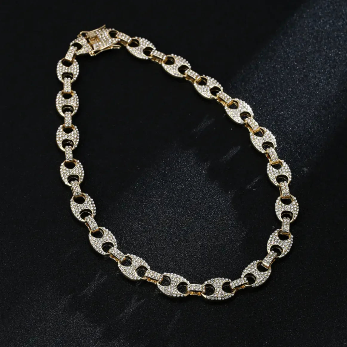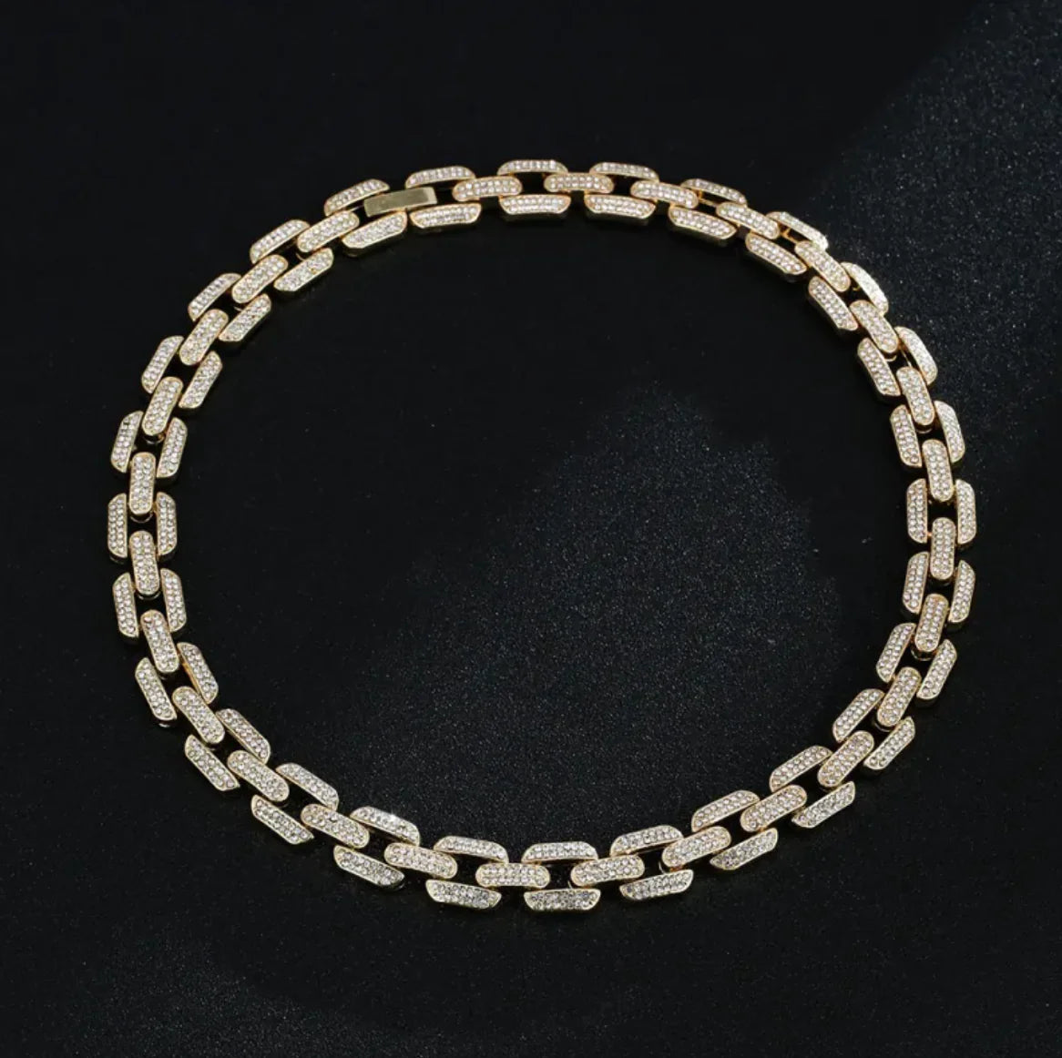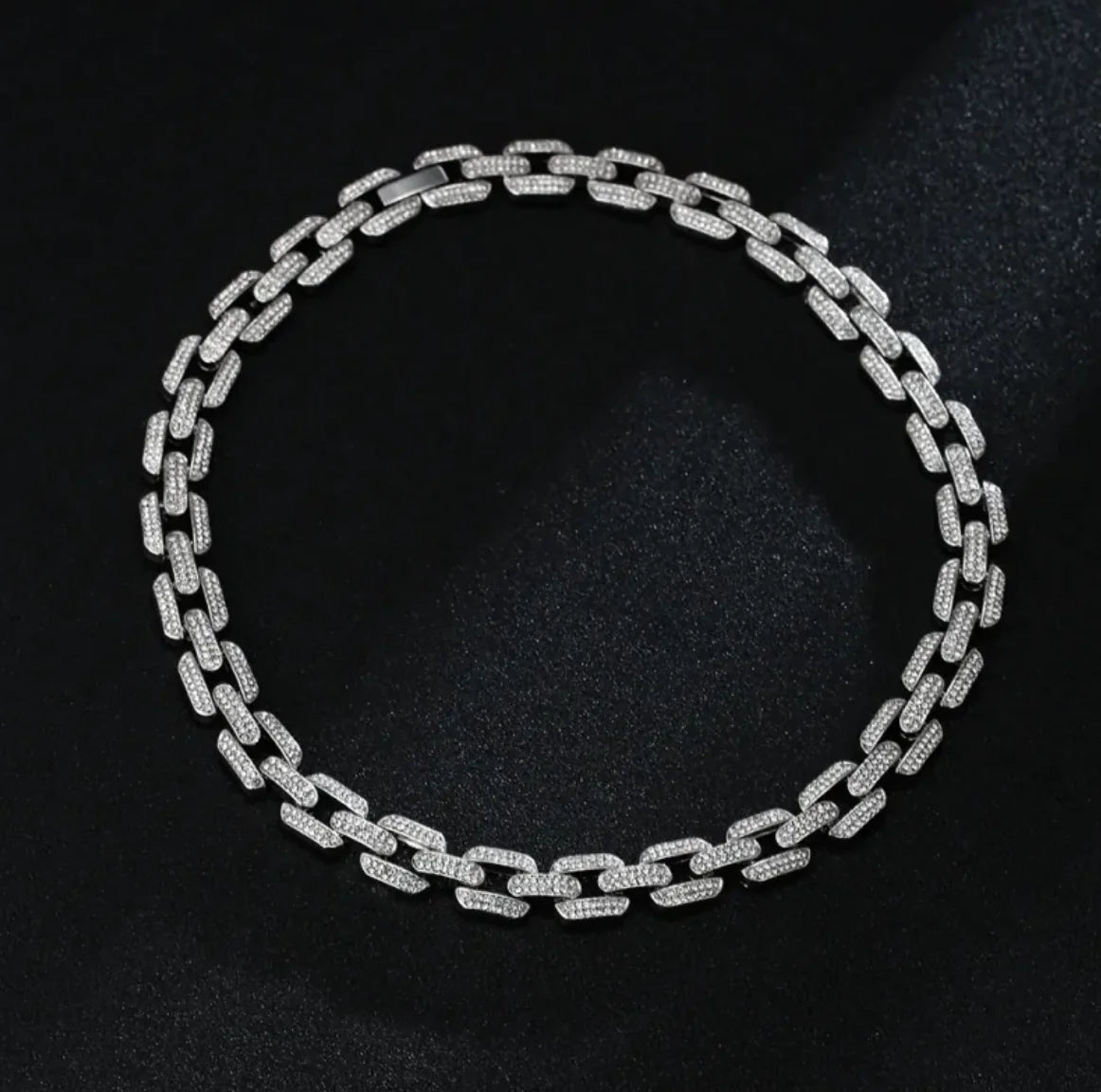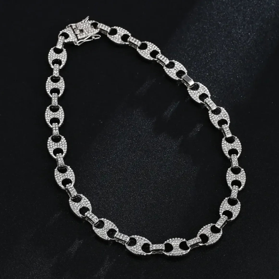 Make a bold fashion statement with this stunning full diamond inlaid necklace. Designed for trendsetters, this eye-catching piece features sparkling diamonds that cover the entire necklace, giving it a luxurious and glamorous appeal. Perfect for special occasions or elevating everyday outfits, this necklace adds a touch of sophistication and sparkle to any look.
