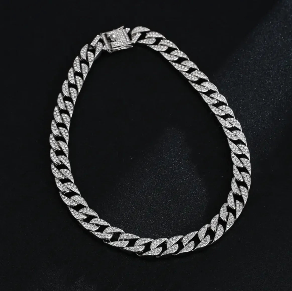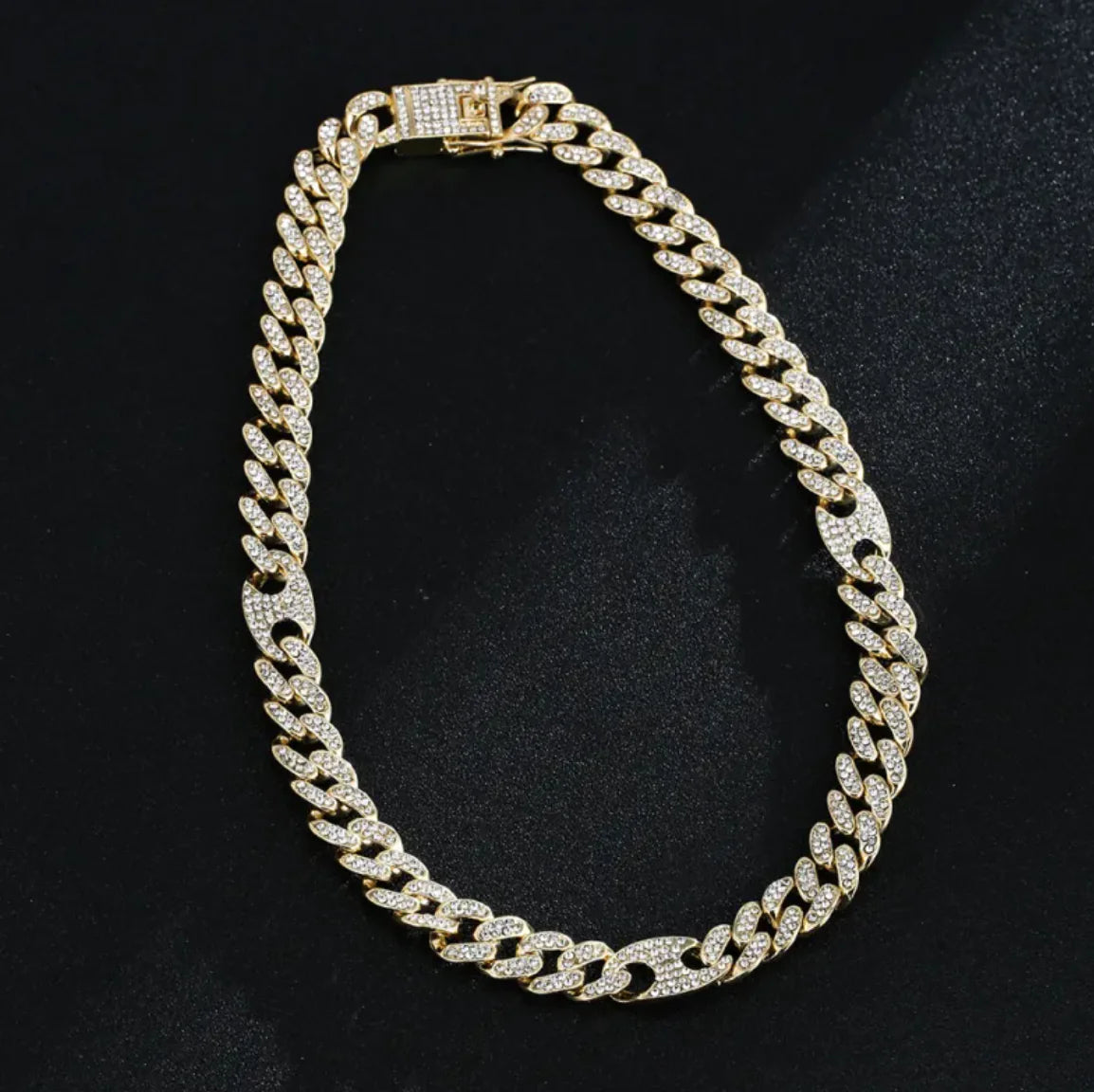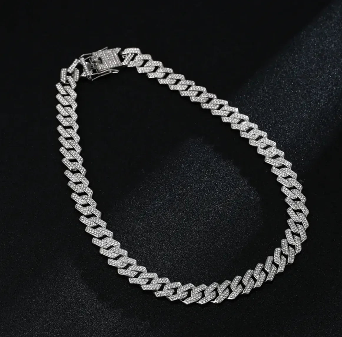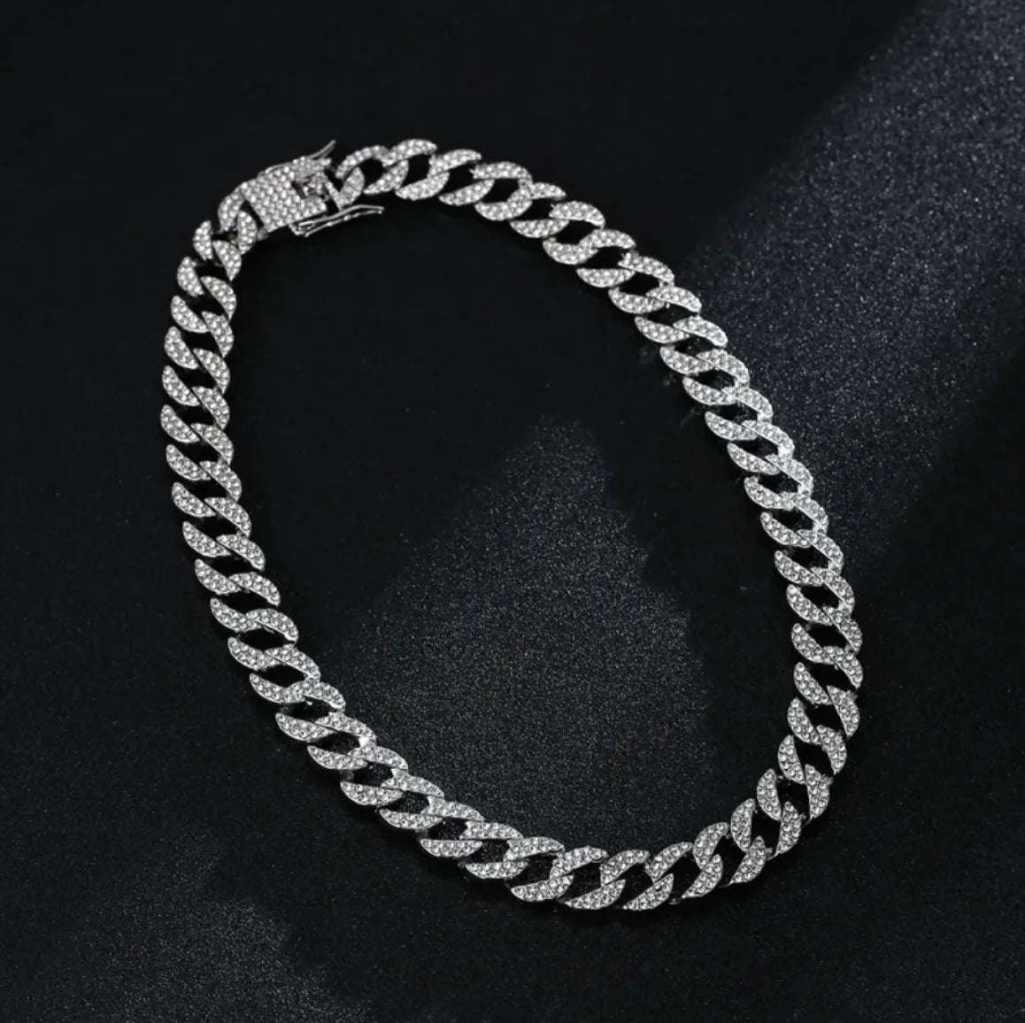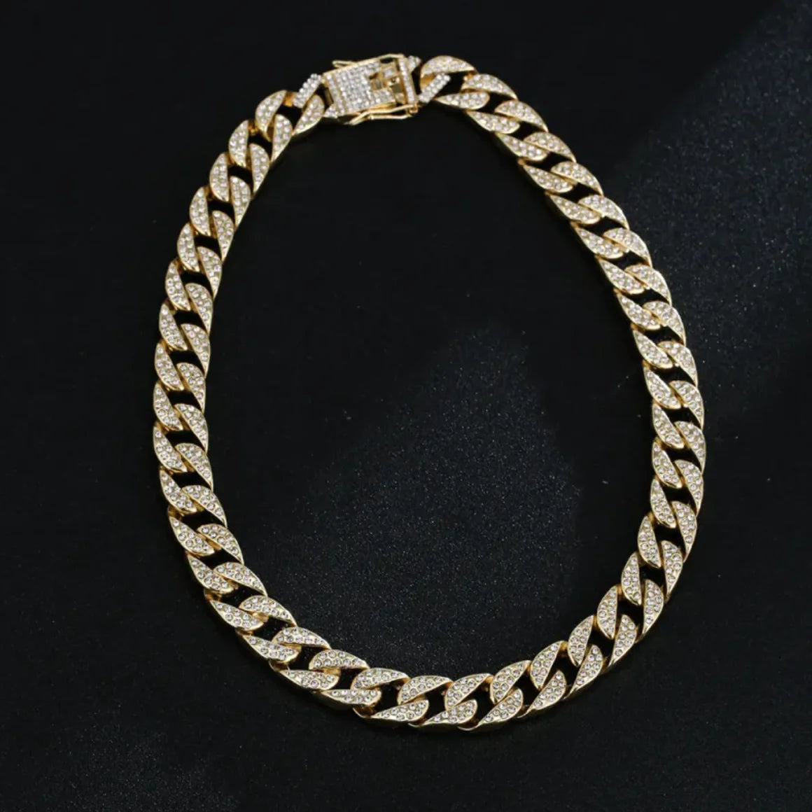 Make a bold fashion statement with this stunning full diamond inlaid necklace. Designed for trendsetters, this eye-catching piece features sparkling diamonds that cover the entire necklace, giving it a luxurious and glamorous appeal. Perfect for special occasions or elevating everyday outfits, this necklace adds a touch of sophistication and sparkle to any look.