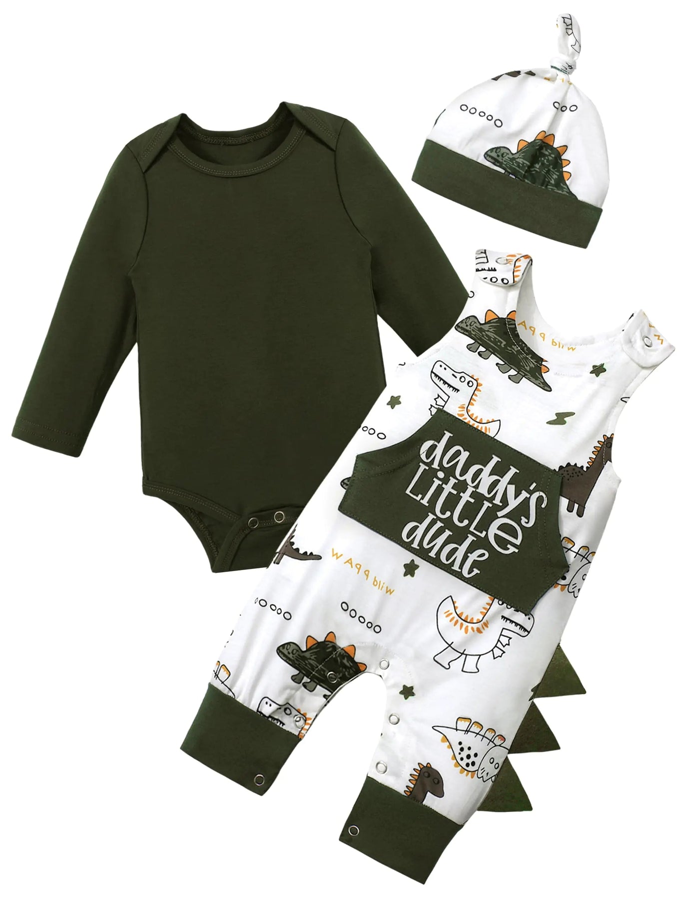 [Nice Material of Baby Boy Clothes: This baby boy dinosaur suit is made of high-quality cotton fabric breathable. Skin-friendly material keeps baby boys comfortable all day long. Design highlights of Baby Boy Outfits: Solid color long sleeve romper matched with colorful cartoon dinosaur overalls. The dinosaur design on the trouser legs is also cute make little boy look very smart. "Details of Baby Boy Dinosaur Suit: Snap closure for easy putting on and taking off. Hemming on cuffs and trouser legs are also more warm and close-fitting. This baby boys clothing is very suitable for growing babies." Suitable Ages of Baby Boy Overalls Suit: Cute baby boy outfits 0-3 months or 3-6 month baby boy clothes baby boy clothes 6-9 months 9 month baby boy clothes baby boy outfits 12-18 months. Package Details: 1 x Long Sleeve Romper + 1 x Dinosaur Overalls + 1 x Cute Hat. Can Be Worn on Different Occasions: This adorable baby boy dinosaur overalls set is very suitable for wearing for baby photo albums baby photoshoots family party birthday party daily wear. It can also be a great gift to baby boy you love.]